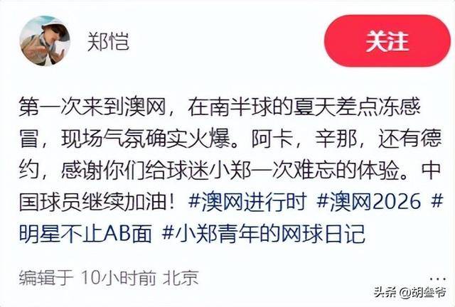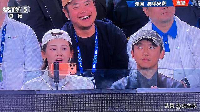 当天郑恺是以 “澳网特邀网球大使” 的身份来观赛的,解说员镜头扫到第一排的时候,特意介绍了他:“这是青年演员郑恺,本次澳网观赛大使。”