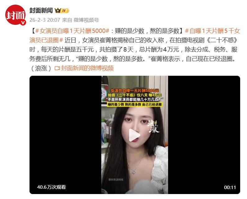 据2月3日报道,一句“赚的是少数,熬的是多数”,让女演员崔菁格和她那“一天5000元”的片酬,猝不及防地成了热议焦点。近日,她公开揭秘自己在热播剧《二十不惑》中的收入明细,并宣布已退圈,瞬间撕开了娱乐圈收入“冰与火”的两极图景。