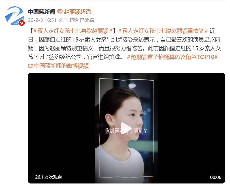 据2月3日报道,最近,因颜值一夜爆红的15岁素人女孩七七(赵钰琪),在一段采访里给出了一个超出许多人预料的答案。当被问及最喜欢的演员时,她没有选择当下最火的流量偶像,而是毫不犹豫地报出了赵丽颖的名字。理由很简单:因为她“特别重情义,而且很努力很吃苦”。