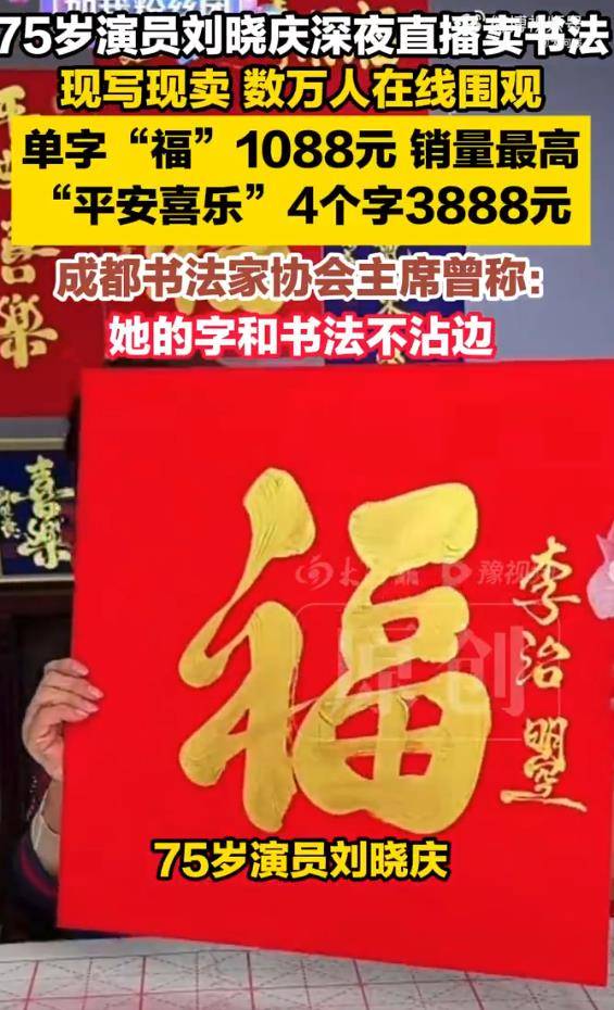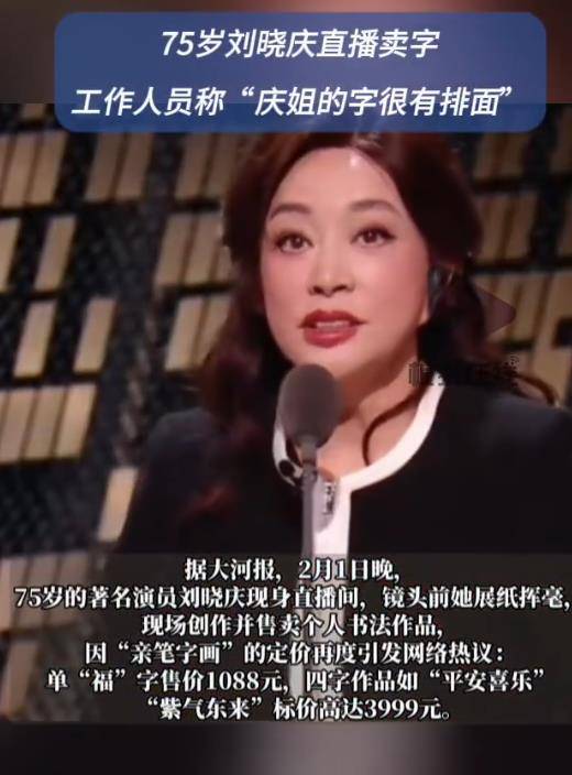 深夜直播间,灯光聚焦。75岁的演员刘晓庆铺开宣纸,提笔蘸墨,手腕悬转间,一个饱满的“福”字跃然纸上。评论区迅速滚动起“下单”指令,工作人员在一旁强调:“庆姐亲笔,盖章装裱,过年挂在中堂很有排面。”售价随即弹出:单字“福”,1088元。