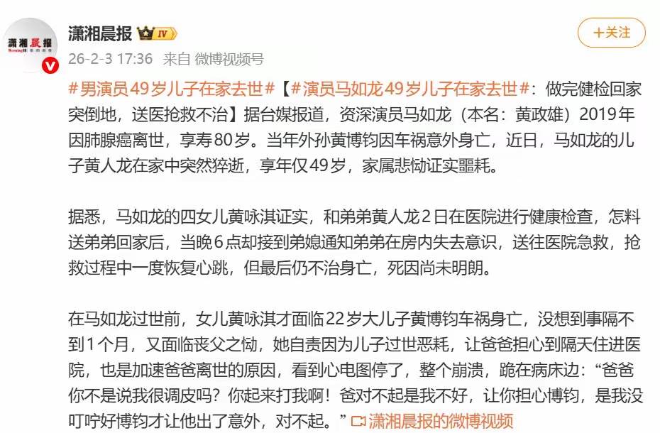 太离奇了!2月3日,演员马如龙的儿子黄人龙被曝在家中去世。