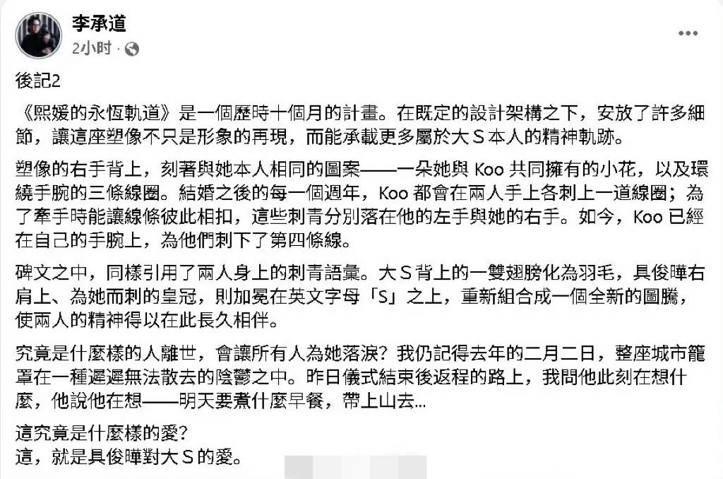 据设计师透露,大S的这尊雕像具俊晔深度参与设计和监工,甚至自掏腰包花了310万台币打造。