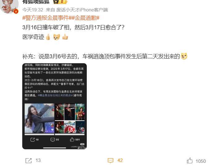 这也成了网友眼中的一大槽点,觉得按照她的解释,她刚撞车时伤的严重,到了不能自己处理车祸的地步,那车祸后才过十几天,怎么脸就恢复了?