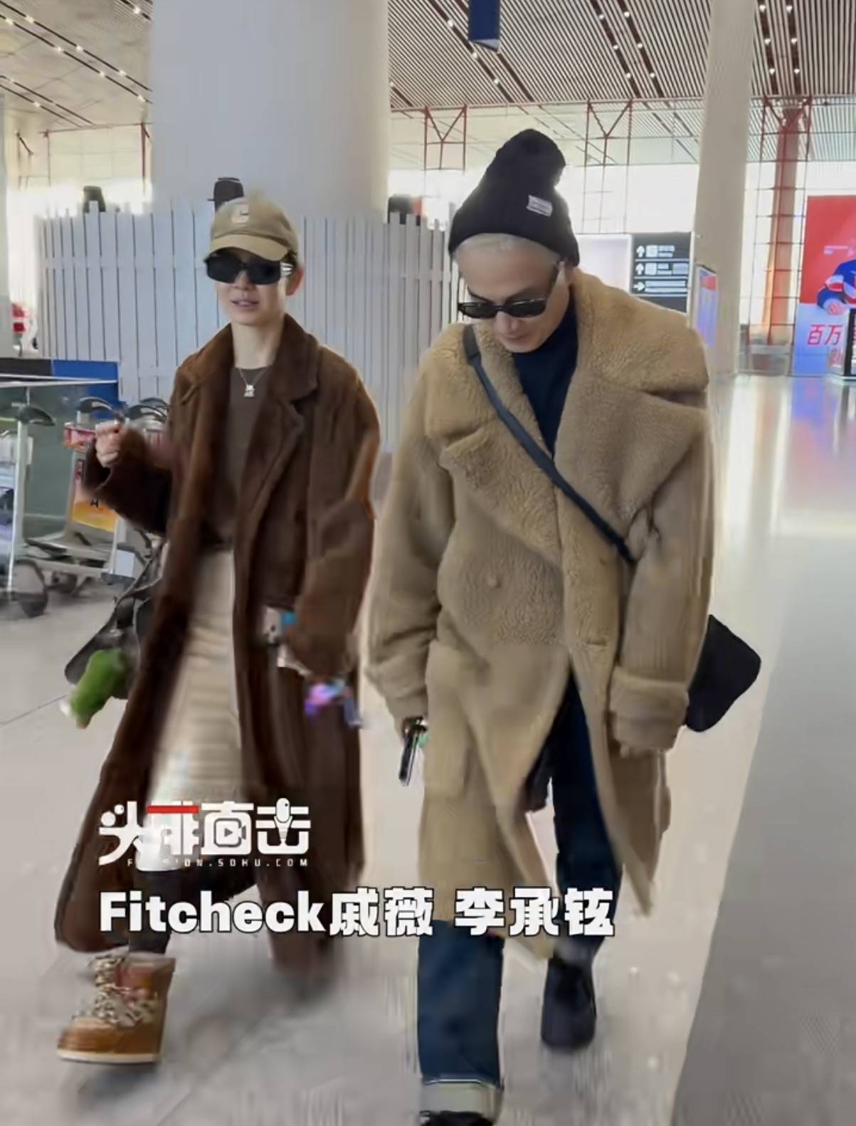 其实戚薇的穿搭没什么,深棕色泰迪熊外套配棒球帽,休闲中带一点慵懒。而李承铉的穿搭,就有点一言难尽了。