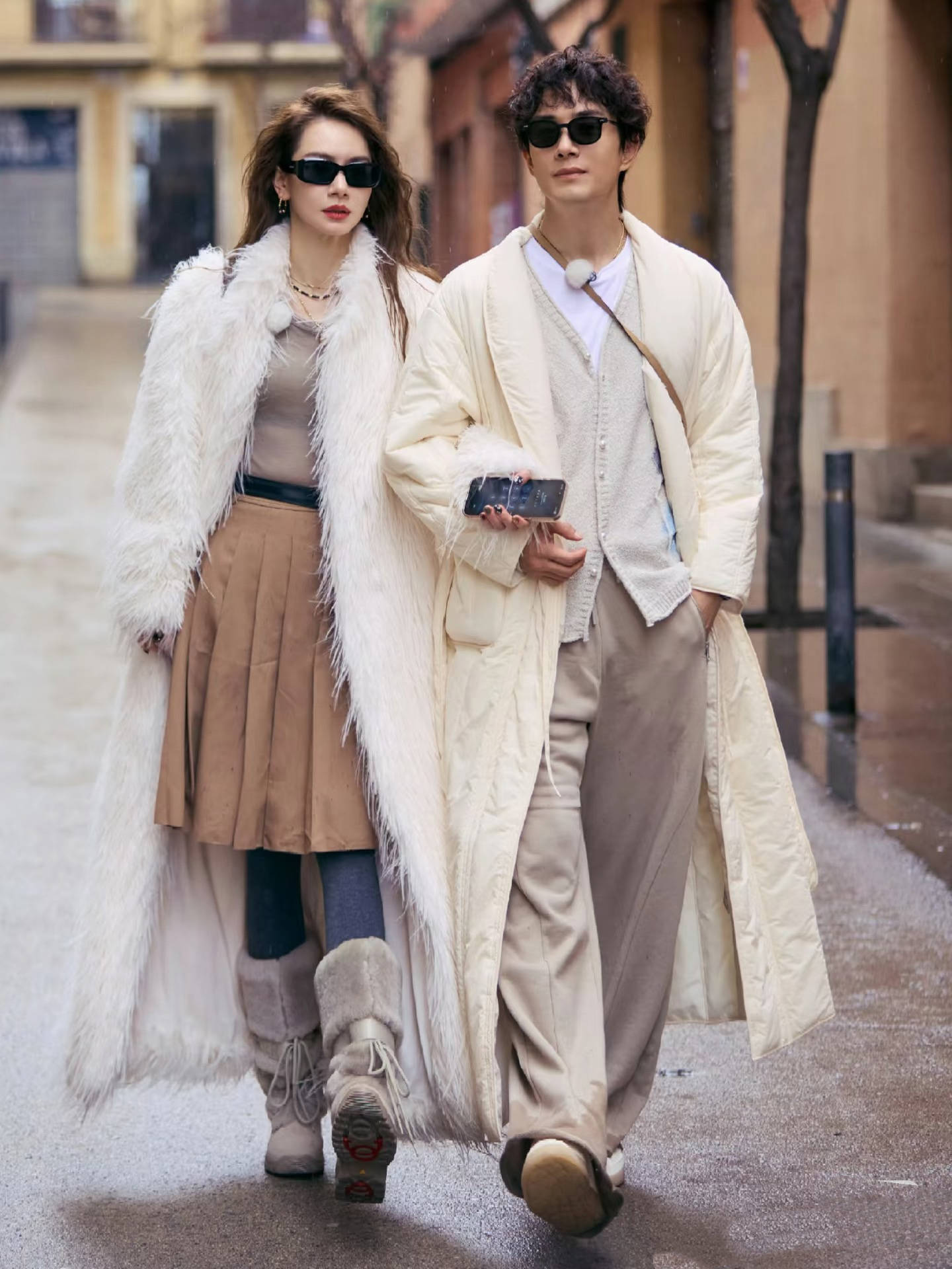 戚薇穿白色环保皮草外套,长款的版型保暖性极好,却一点都不显臃肿。李承铉白色棉被款羽绒服,内搭也是同色系,更多了点斯文气。