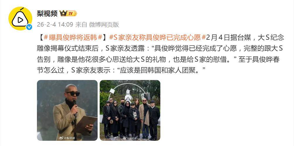 2月2日,一场纪念雕像的揭幕仪式,为一段跨越海峡的“守墓”生活画上了句号。据台媒2月4日报道,在大S逝世一周年纪念雕像揭幕仪式结束后,S家亲友透露,具俊晔已决定返回韩国与家人团聚,原因直白而简单:“他觉得已经完成了心愿,完整的跟大S告别。”