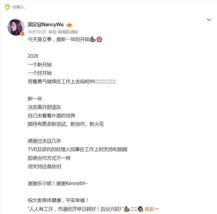 选择在象征万物复苏的立春日发文,胡定欣的时机拿捏得颇有深意。她在微博中清晰传递了三个信号:一是主动求变,为寻求“新尝试、新创作、新火花”而走;二是好聚好散,特别感谢了TVB、邵氏及经纪人,强调“合作方式虽变,支持依旧”;三是心系行业,一句“人人有工开,市道经济早日转好”,道出了不少同行的心声,瞬间引发广泛共鸣。