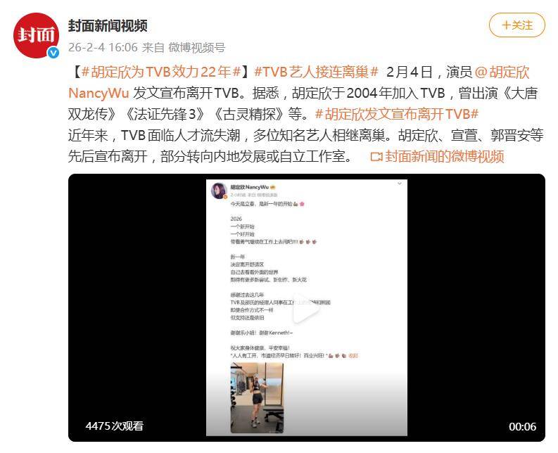 2月4日,TVB两届视后胡定欣的一纸告别文,给本就热议不断的TVB人才流失潮又添了一把火。一句“离开舒适区,自己去看看外面的世界”,看似是个人职业规划,却精准戳中了老