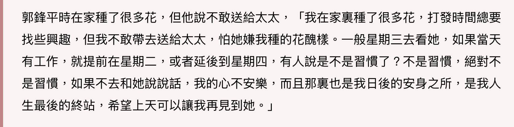 郭锋在前四年曾经受访表示,妻子离世之后每一周都会去探望亡妻。别以为时间过去了,抚平了伤痛,他走出了阴霾,就改变了这个做法,实际上现在的他仍然坚持逢周三就去太太安葬的地方与太太聊天。郭锋自曝每周都会去,一般是周三去,如果当天有工作,要不就提前到周二,要不就延后到周四,总之刮风下雨都不会错过。每一次去的时候,他都会买上一束鲜花,也因此与附近的花店老板已经相熟,成为了朋友——只要他打一个电话,店主就会准备好花束,待他开车到店门口,一手交钱一手交货。