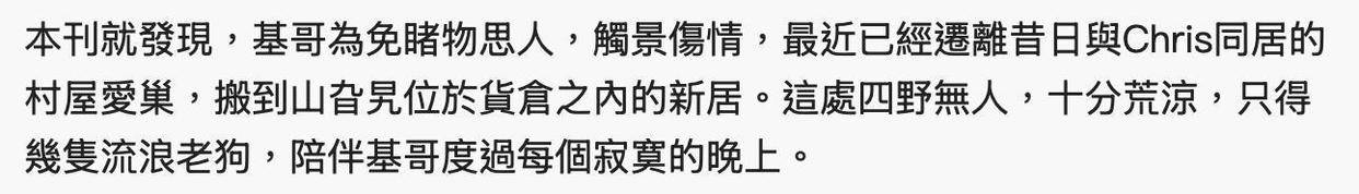 相比过去那温馨的爱巢,李龙基现在住的地方就显得相对简朴又荒凉。据香港媒体透露,他的新住所位于比较偏远的地区,四周荒草丛生,周边是一些大型货仓和重型停车场,到了晚上,街灯稀稀拉拉的。每天工作结束后,李龙基会自己开车回到仓库那边,房子周围还用铁皮圈了起来,门也是用铁闸锁上的。孤单一人,又没有灯火通明的路灯照耀,再加上远处的流浪狗在徘徊,整个氛围显得格外凄凉。