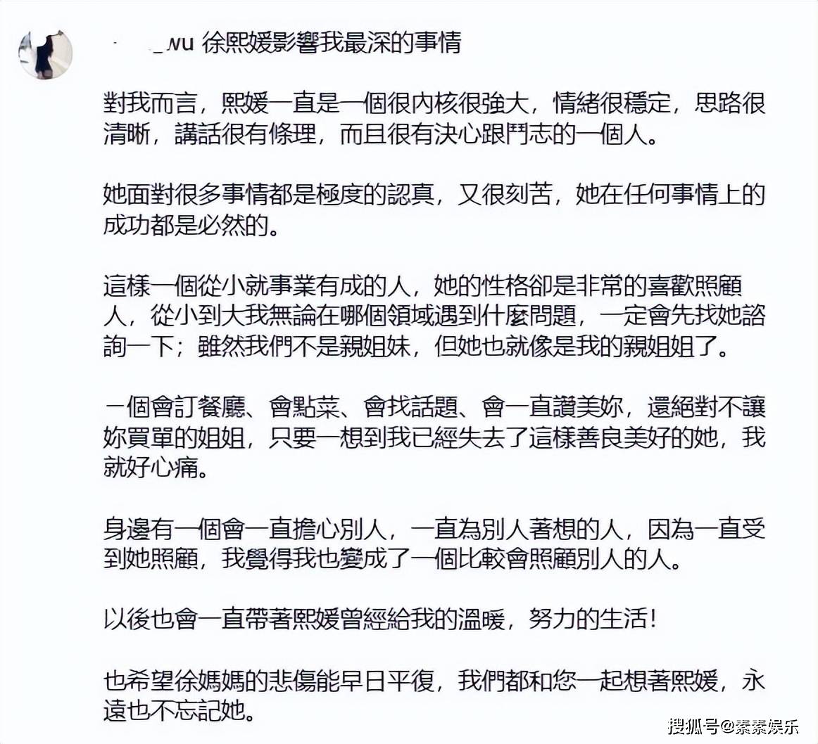 她说大S是一个会一直担心别人,一直为别人着想的人,因为一直受到她的照顾,是熙媛曾经给了我温暖,努力生活。