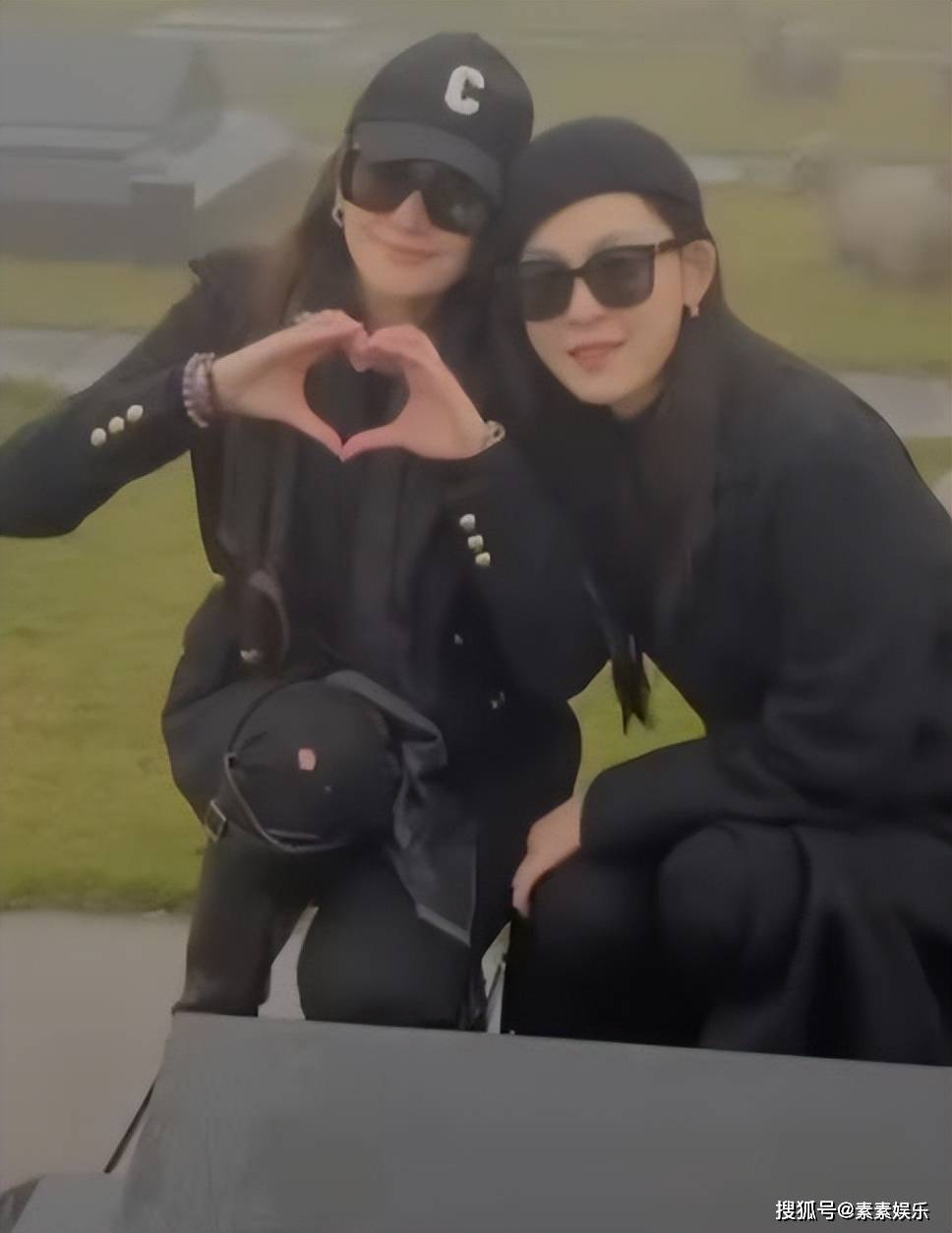 吴佩慈和范玮琪在大S的墓碑前合影,吴佩慈对着镜头比心,姐妹靠在一起合影。