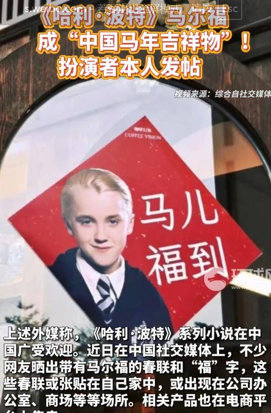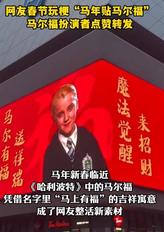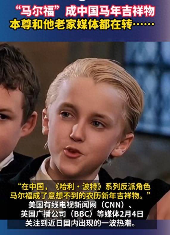 当中国商场的巨幅春节海报上,出现《哈利·波特》中那位金发的斯莱特林“反派少爷”时,一场意想不到的文化化学反应正在发生。随着2026年农历马年临近,德拉科·马尔福因其中文译名中自带的“马”与“福”字,被中国网友捧为“天选吉祥物”,而扮演者汤姆·费尔顿的亲自下场玩梗,更将这场狂欢推向了高潮。