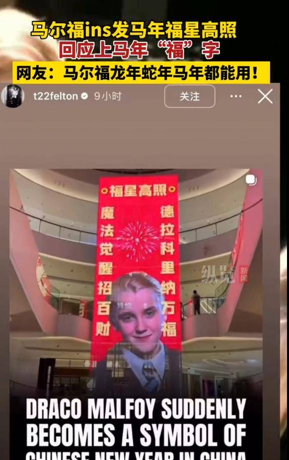 真正点燃这场跨国互动的,是演员汤姆·费尔顿本人的回应。2月3日,他在Instagram上转发了一张摄于河南商丘某商场的照片,画面里,巨大的马尔福角色海报与春节装饰融为一体。下方字幕写着:“德拉科·马尔福意外成了中国春节的吉祥物”。次日,他更进一步在ins上发布一张照片,照片中是对联:“魔法觉醒招百财,德拉科里纳万福”,横批“福星高照”。这副对联不仅工整,更巧妙地将“德拉科”谐音为“得拉福”。