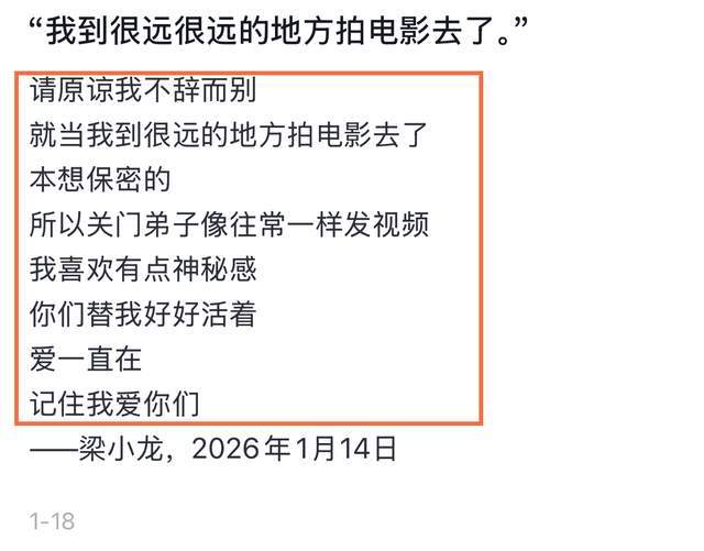 之后,梁小龙的账号便公开噩耗,虽然解释这其中的原因是梁小龙自己的意思(请原谅我不辞而别,就当我到很远的地方拍电影去了,本想保密的,所有关门弟子像往常一样发视频,我喜欢有点神秘感,你们替我好好活着,爱一直在,记住我爱你们),但给人的感觉总是那么不自然。
