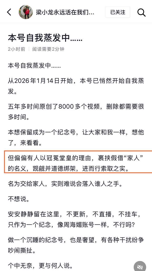 梁小龙遗孀公开这则声明之后,账号的运营人也表示只想保留一个纪念号,从来没有利用账号进行牟利,另外他还斥责某些人裹挟假借其家人名义,觊觎并行道德绑架,进而行索取之实。