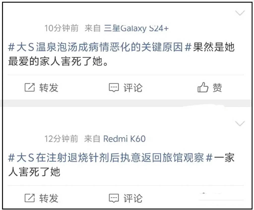 网友纷纷表示:难道没有及时去医院抢救的锅最后甩给了她本人吗?是大S主张不去医院,想要回家,在去机场的路上心脏骤停,不是把责任推给她自己吗?