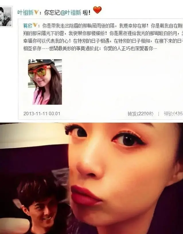 面对这些诽谤,蒋欣连发了两条微博,既承认了分手事实,也坚定地维护了叶祖新。