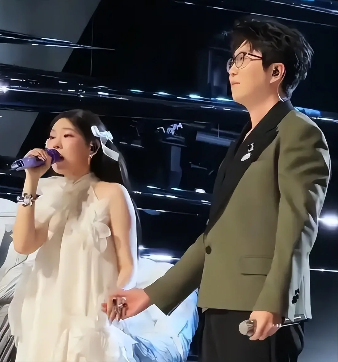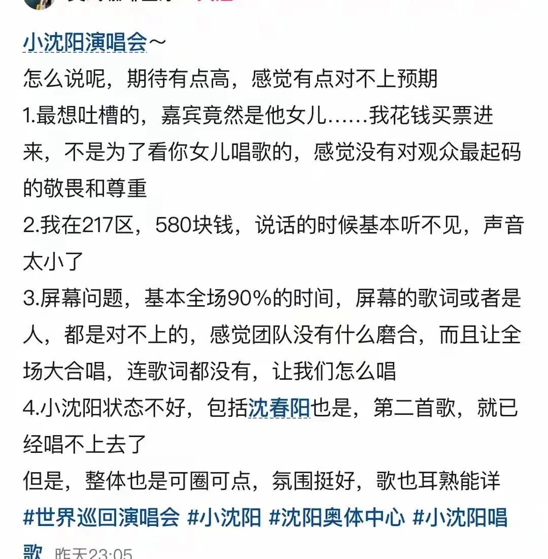 跑调、节奏混乱,再加上现场屏幕歌词不同步、音响效果拉胯,有观众当场高喊退票,吐槽“花钱不是来看一家三口唱K”。
