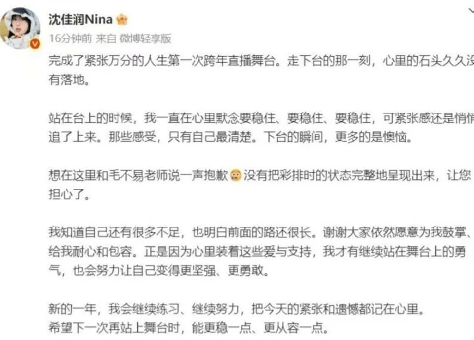 次日,沈佳润发文致歉,称紧张导致未能呈现彩排状态,毛不易在评论区安慰“舞台是遗憾的艺术”。