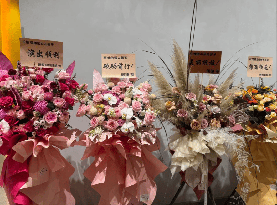这次是张馨予的人生第一次的舞台剧,所以全家都到场祝贺了,娘家妈妈,还有老公和公婆都到场支持,看张馨予妈妈送的花篮写着:祝福美丽的女儿馨予演出顺利,落名是最爱你的妈妈,而老公何捷送了两个花篮,一个是:愿我的爱人馨予砥砺前行,另一个是:我的小孩儿馨予美丽绽放。