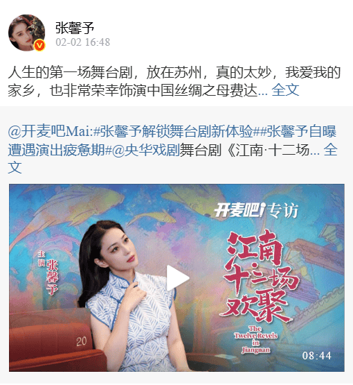 在2月5日,张馨予的话剧首演,台上的张馨予真的是美出新高度,倒是比长剧还要凸显她的美,微卷的长发里面穿着旗袍,外面陪着大衣,非常有苏州才女之美了,在台上张馨予的台风很稳,表演到位,观众看了连连叫好。
