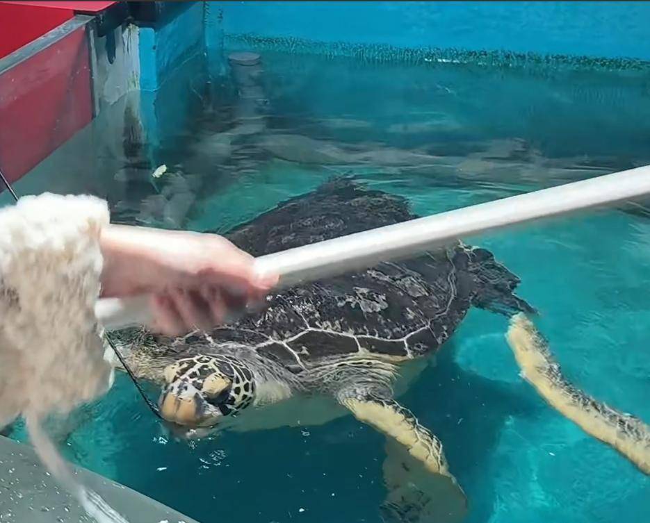 只见几只大海龟慢悠悠地游过来,伸长脖子一口咬住白菜,小玥儿吓得手一抖,差点把竿子扔水里,筱梅赶紧稳住她的手,两人齐心协力 “投喂” 成功,小玥儿脸上立马露出了得意的小表情。