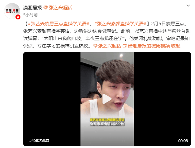 (来源:潇湘晨报)2月5日凌晨三点,张艺兴素颜直播学英语,边听讲边认真做笔记。此前,张艺兴直播中还与粉丝互动读弹幕:“太阳出来我爬山坡,半夜三点我还在学”。他关闭礼物