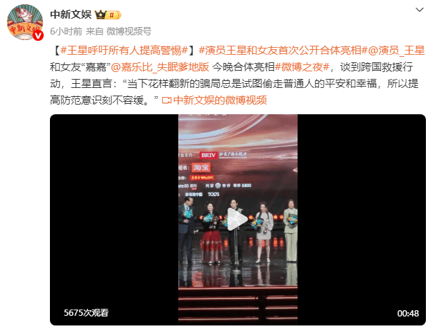 (来源:中新文娱)演员王星和女友“嘉嘉”今晚合体亮相微博之夜,谈到跨国救援行动,王星直言:“当下花样翻新的骗局总是试图偷走普通人的平安和幸福,所以提高防范意识