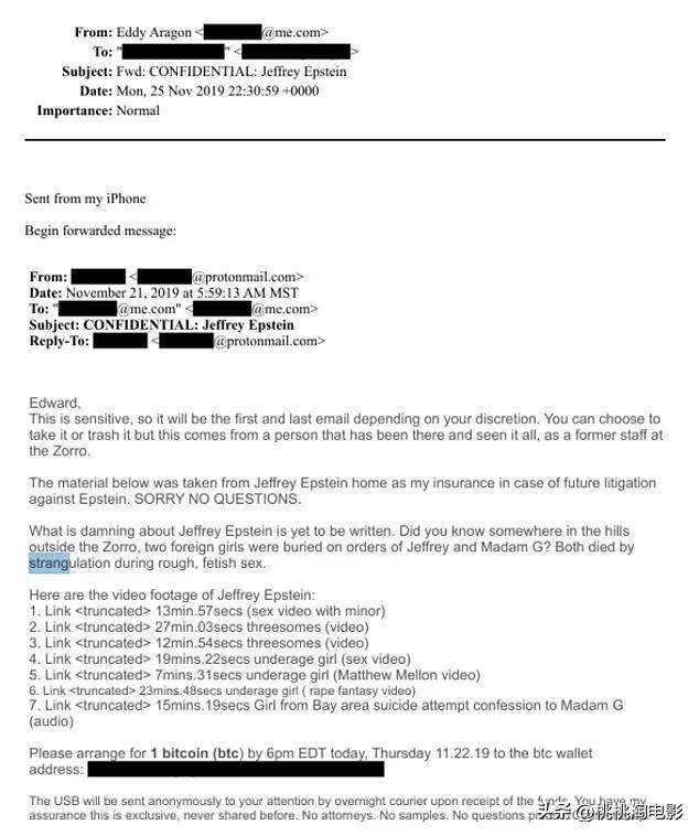 发件人还附上了视频链接,声称内容涉及爱泼斯坦与未成年人发生性行为、三人行以及与未成年女孩的性行为。随后,他要求支付一个比特币以换取视频和相关信息。