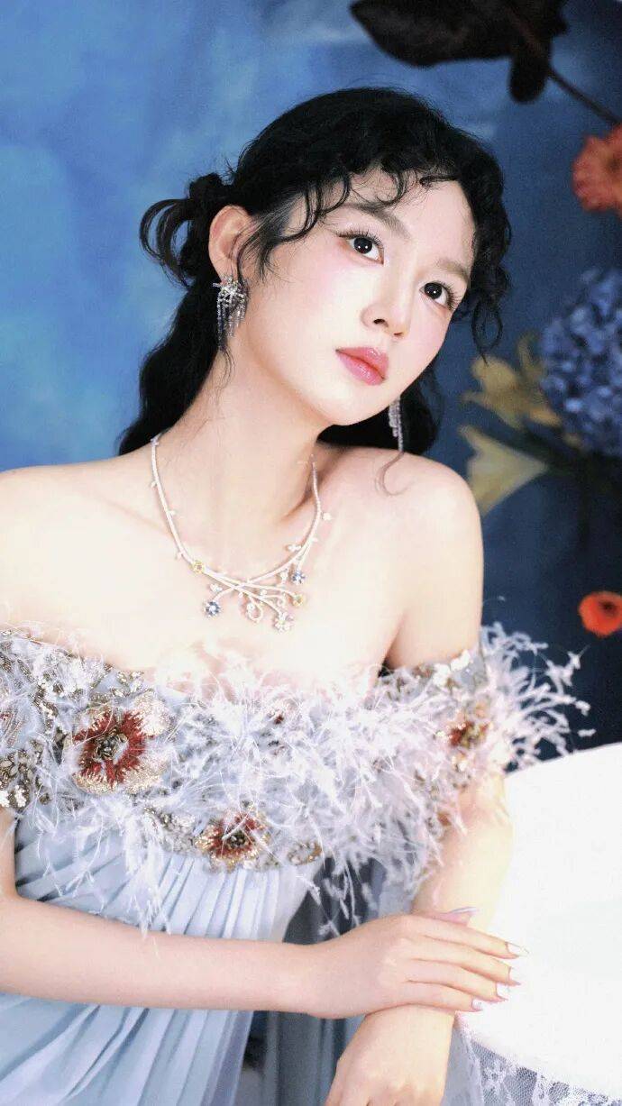 周也身着Rami Kadi 2025春夏定制淡蓝色羽饰纱裙亮相红毯,层叠薄纱与肩部羽毛设计营造出古典油画质感,搭配TASAKI珍珠耳饰及低饱和哑光妆容,被全网盛赞为“深海神女”“莫奈画中少女”。