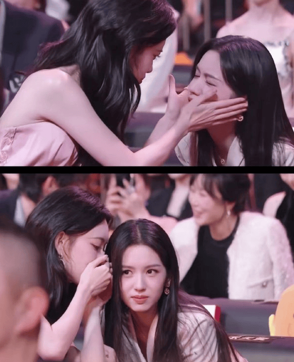 她与周也相邻而坐持续密聊超十分钟,期间贴耳私语、捧脸大笑,因固定姿势聊累后同步转身调整方向继续畅谈。