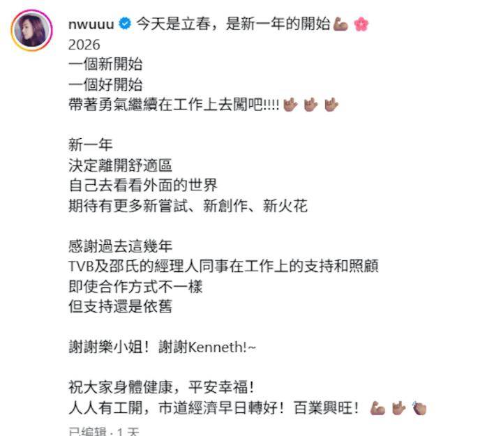 TVB视后胡定欣在2026 年2 月4日立春当天,在社交网正式宣布离开无线,结束双方 22 年的合作关系,她发文称:带着勇气继续在工作上闯吧!!!新一年,决定离开舒适区,自己去看看外面的世界,期