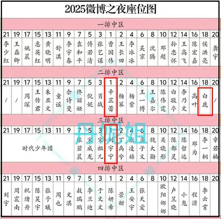 最后就放上网友总结的微博之夜座位图,和去年相比,辛芷蕾升咖最为明显。