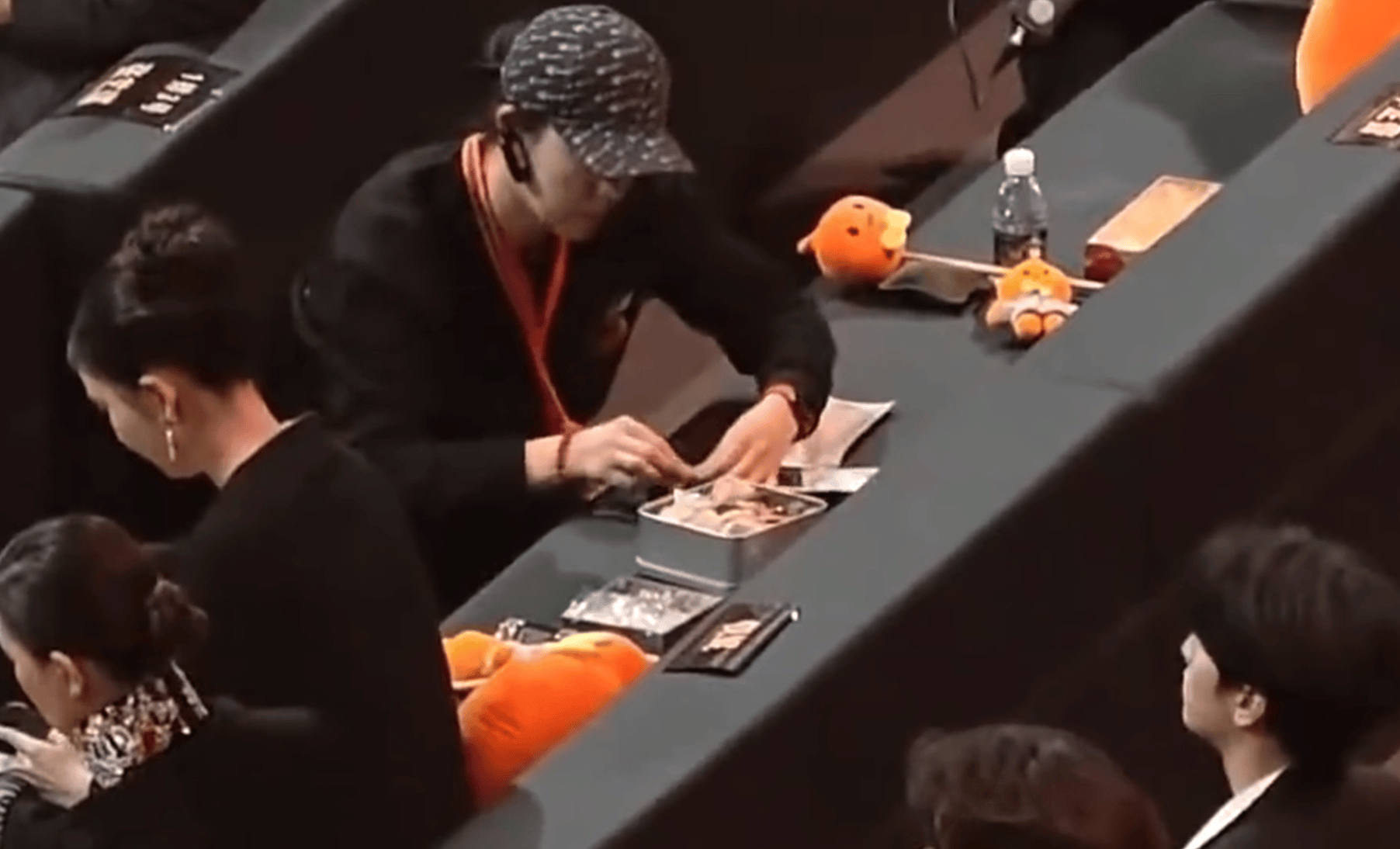 之后就是有工作人员,火速撕了贴纸,按照最初3人座的安排,把顺序都理顺了,明星们才开始依次落座