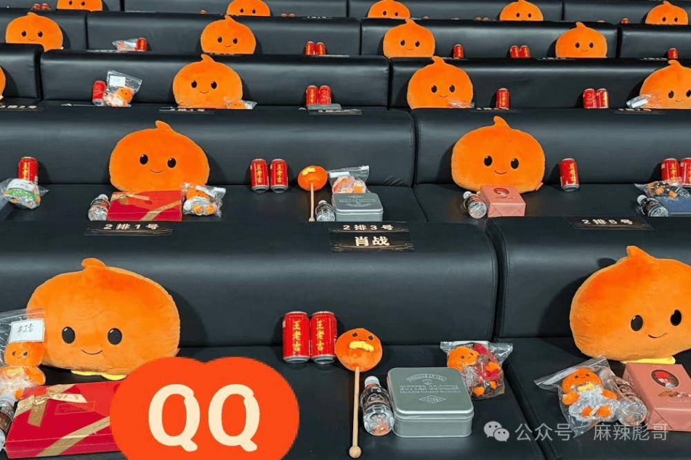 每一个黑色皮沙发上都摆放着一些橙色玩偶和小零食等。