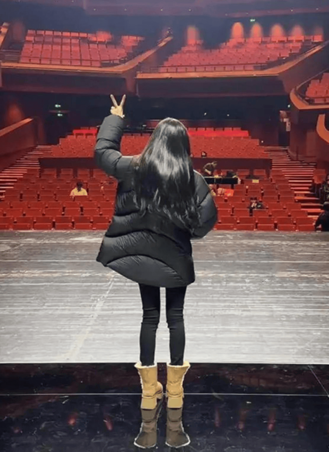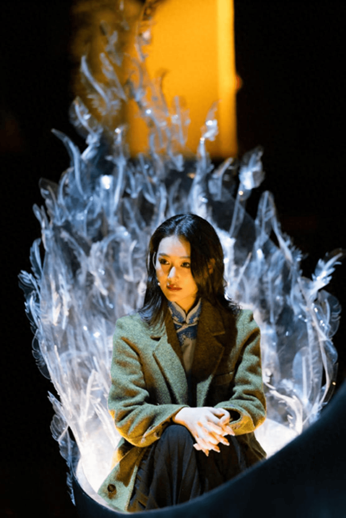 演出当天,她身着深绿色粗花呢外套与刺绣立领上衣,整个人看起来简洁又沉稳。光线落在她脸上时,那种专注的眼神让人完全忘记她曾是演红毯上的时尚明星,反而更像一个沉浸于角色的职业演员。