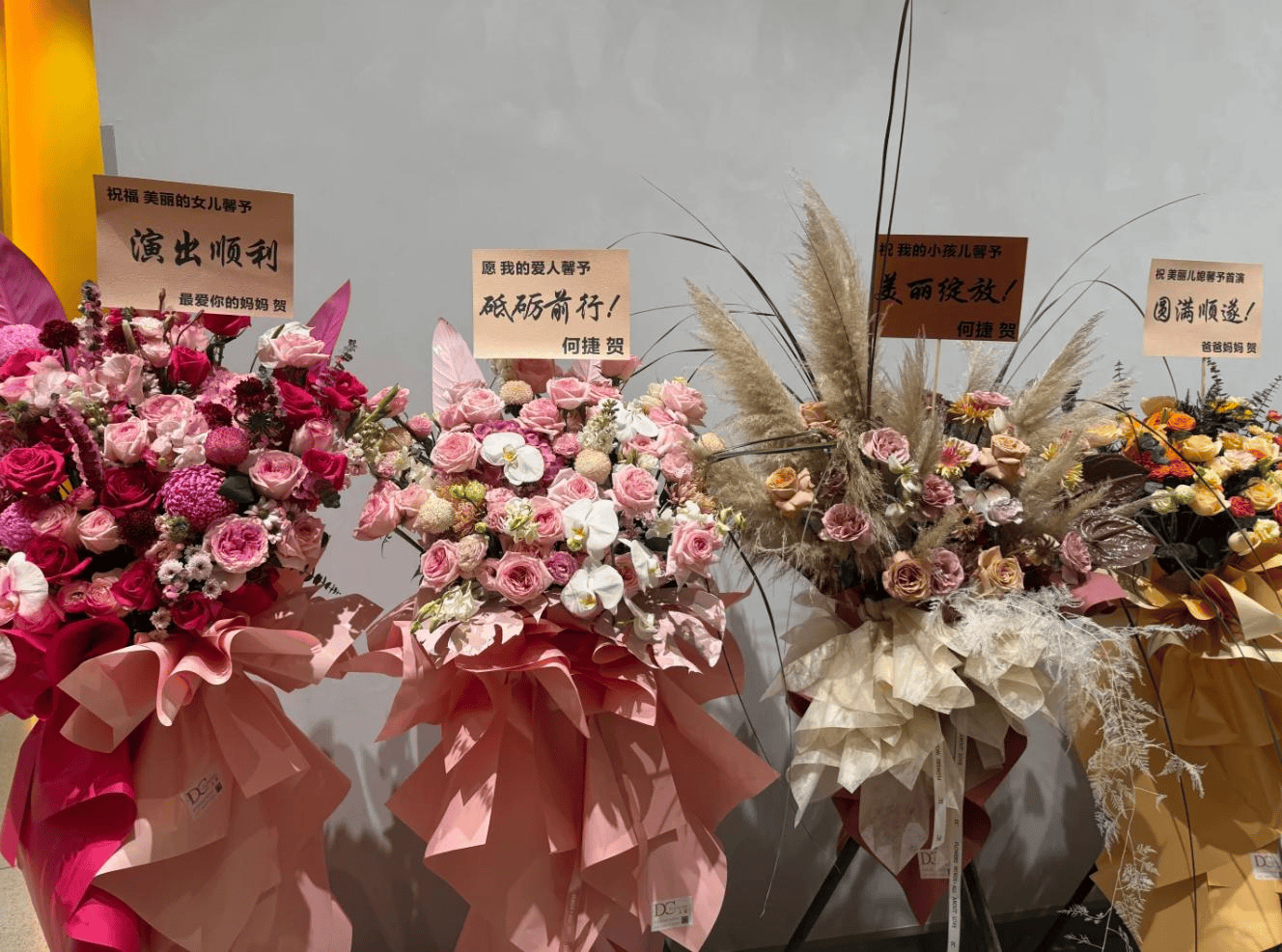 但比起演出本身,更让人注意的是演出现场外的一幕。场馆门口摆满了花篮,其中好几篮都来自她的家人。最醒目的是妈妈送的花束,上面写着对女儿的祝福,看得出母女关系亲密又轻松。而紧随其后的,是丈夫何捷和何家父母送上的花篮。何捷专门准备了两份花,祝福语分别是“我的爱人砥砺前行”和“祝我的小孩美丽绽放”,前后两种称呼有正式也有调皮,隔着文字都能感受到这位军人丈夫的柔情和自豪。