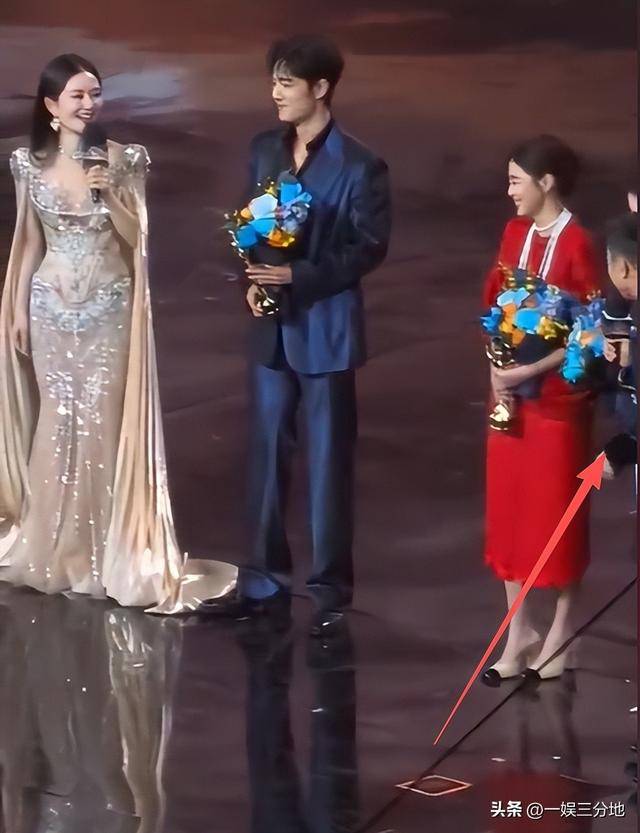 还有,关晓彤的两个鞋跟,都卡到了舞台上。