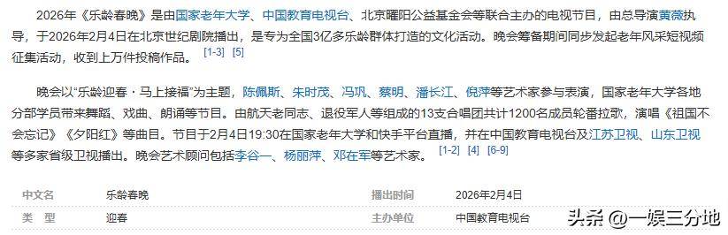 网上查询了一下,《乐龄春晚》是由国家老年大学和教育卫视,一起举办的一档晚会节目。