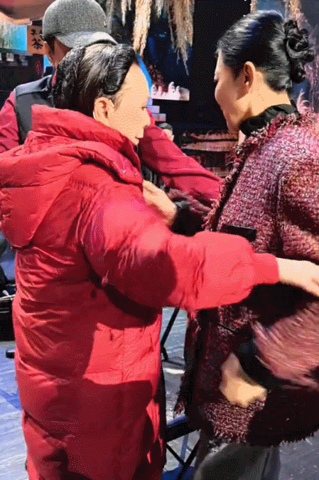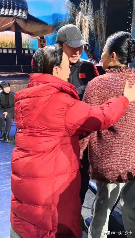 倪萍上来想先和冯巩拥抱致意,蔡明却站在中间“拦”了起来。