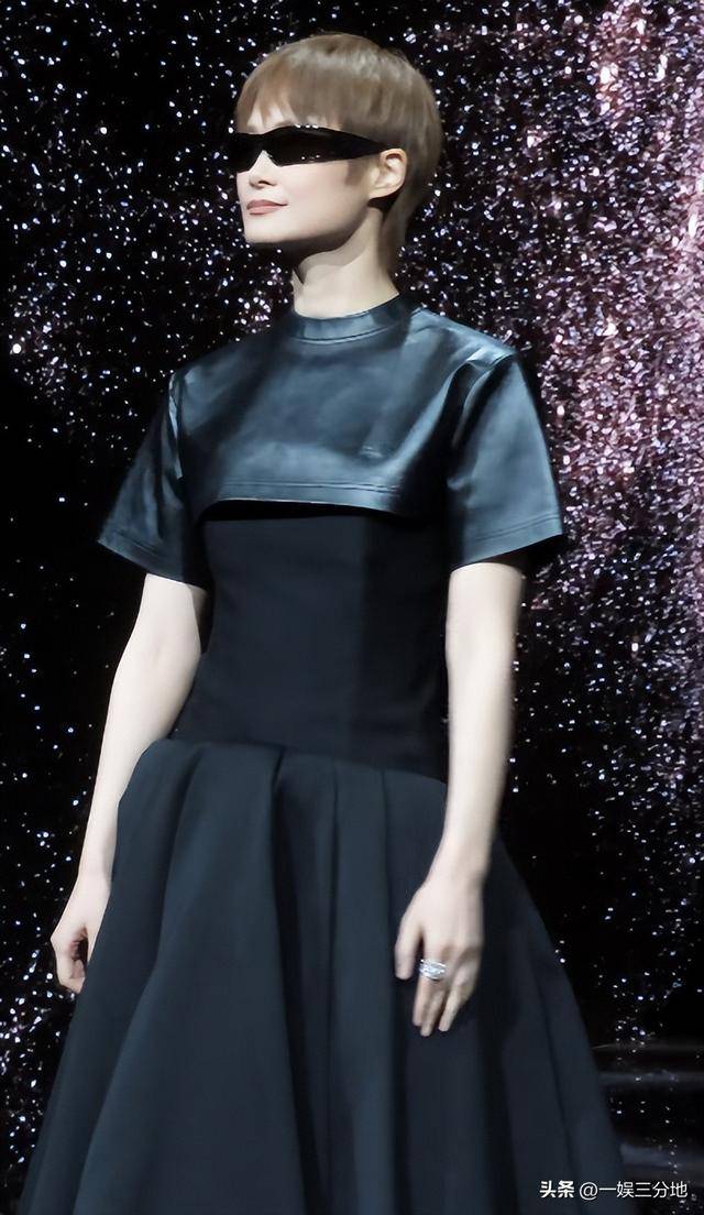 杨幂这次穿的没有那么亮眼,斜露肩深蓝色长裙,发型还是一成不变的贴头皮。