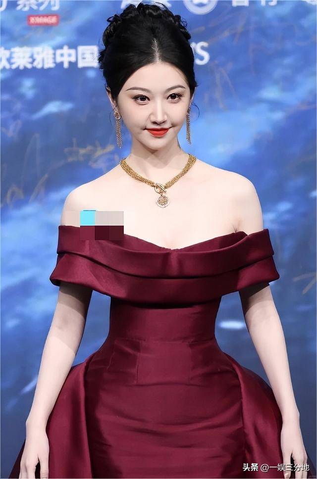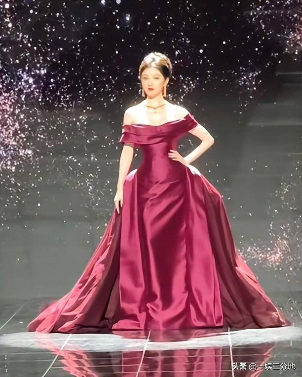 景甜这次穿着玫红色的露肩长裙,盘着头发,显得整个人高贵又优雅。