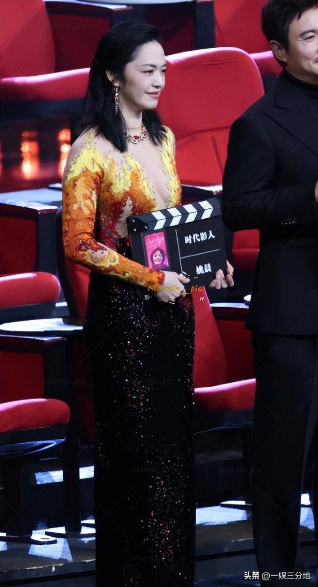 姚晨这次可是在妆造上下功夫了,上半身穿的深v透视装,还是火焰样式的,新奇的很。