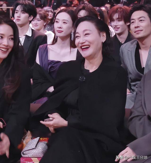惠英红这次的造型也是亮眼的很,黑色的礼服里衬居然是黄色的,吸睛的很。