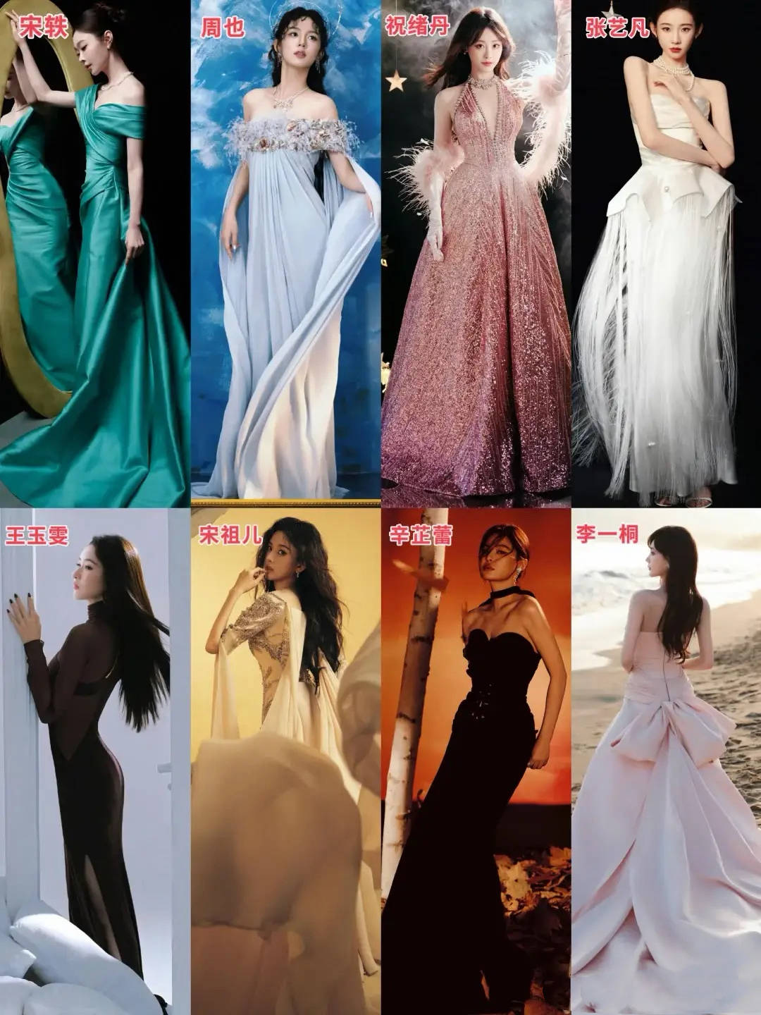 宋轶碧绿色长裙显白贵气,周也水蓝色抹胸裙温婉甜美,祝绪丹粉色亮片裙很闪耀,张艺凡白色流苏羽毛裙仙气十足。
