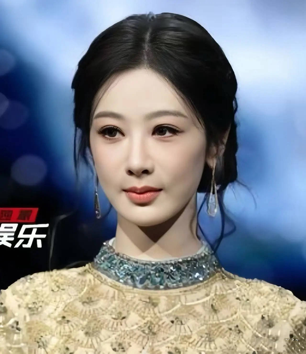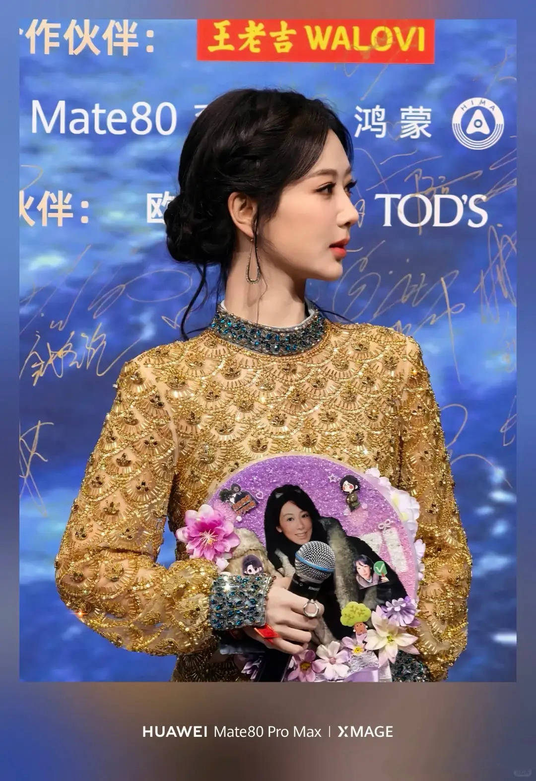 她穿着花奴天伦特别定制的金色礼服,搭配盘发造型主打一个贵气端庄。