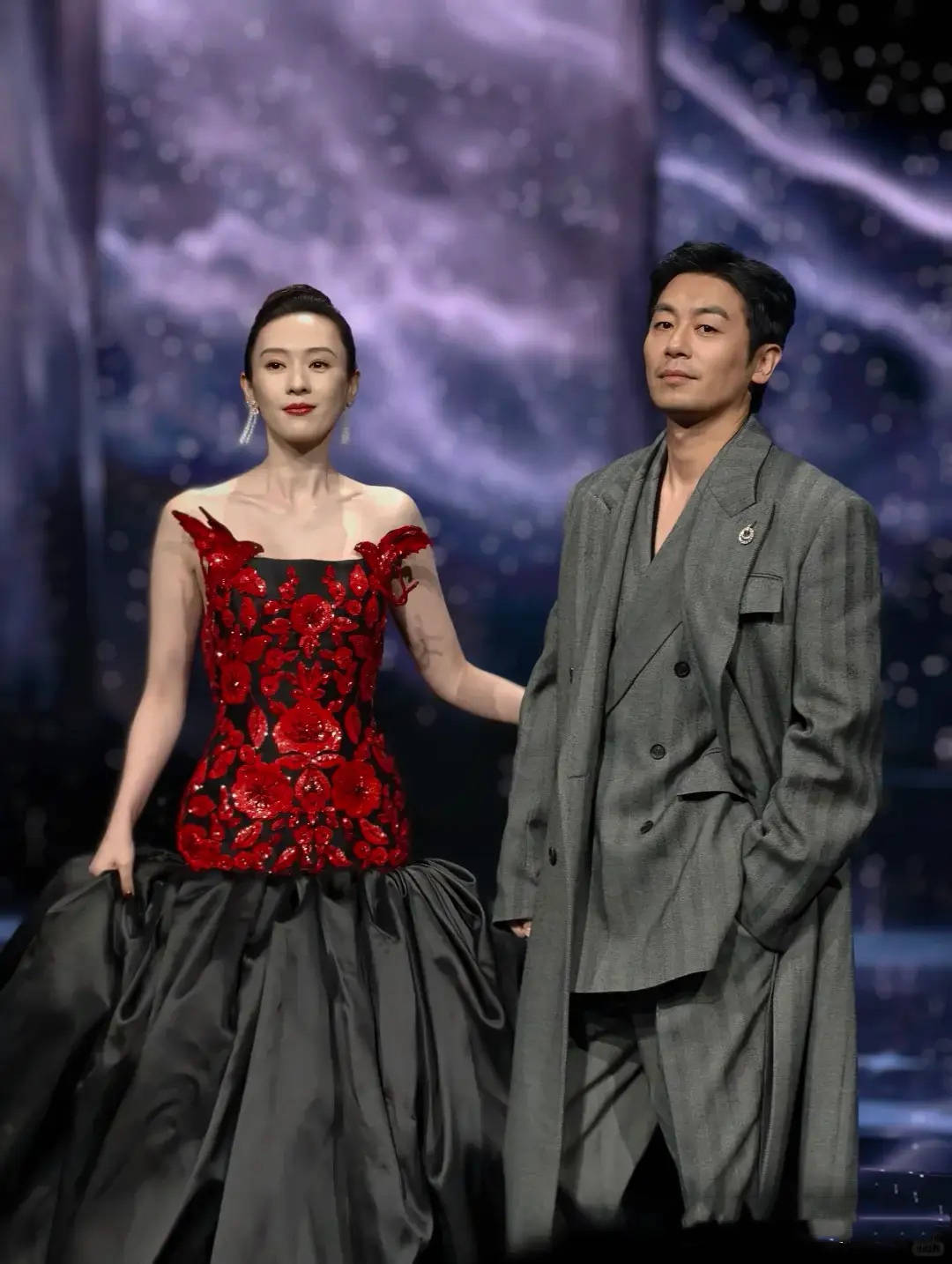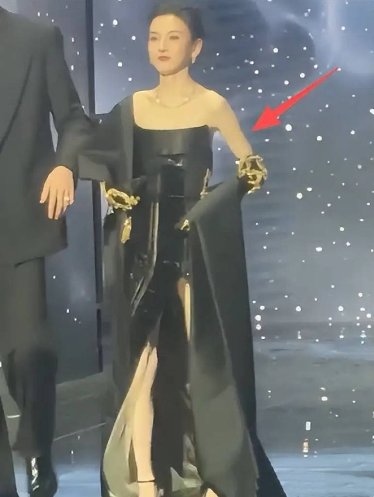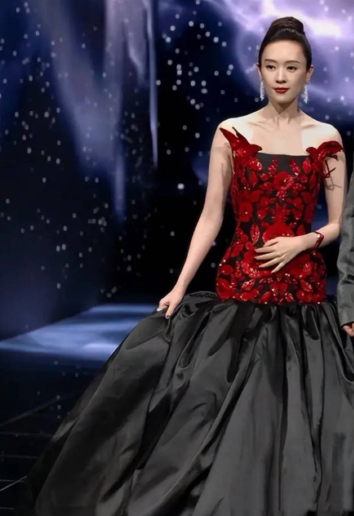 童瑶大背头显老,穿着也有点一言难尽。她这组搭配把深深的年龄感焊在身上,红黑撞色的礼服,很醒目却不够减龄。