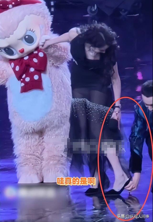 镜头刚好拍到她懵圈的表情,眼睛瞪得溜圆,手还下意识抓着裙摆,好在主持人尼格买提反应快,立马蹲下身徒手把鞋跟拔了出来,全程也就几秒钟,被网友戏称 "舞台版骑士救美"。