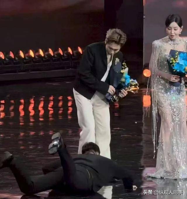 她穿着性感纱裙,梳着复古卷发,本来仙气飘飘地给潮玩 IP 颁奖,结果下台阶时单只鞋跟突然卡在了舞台缝隙里,整个人瞬间僵在原地。